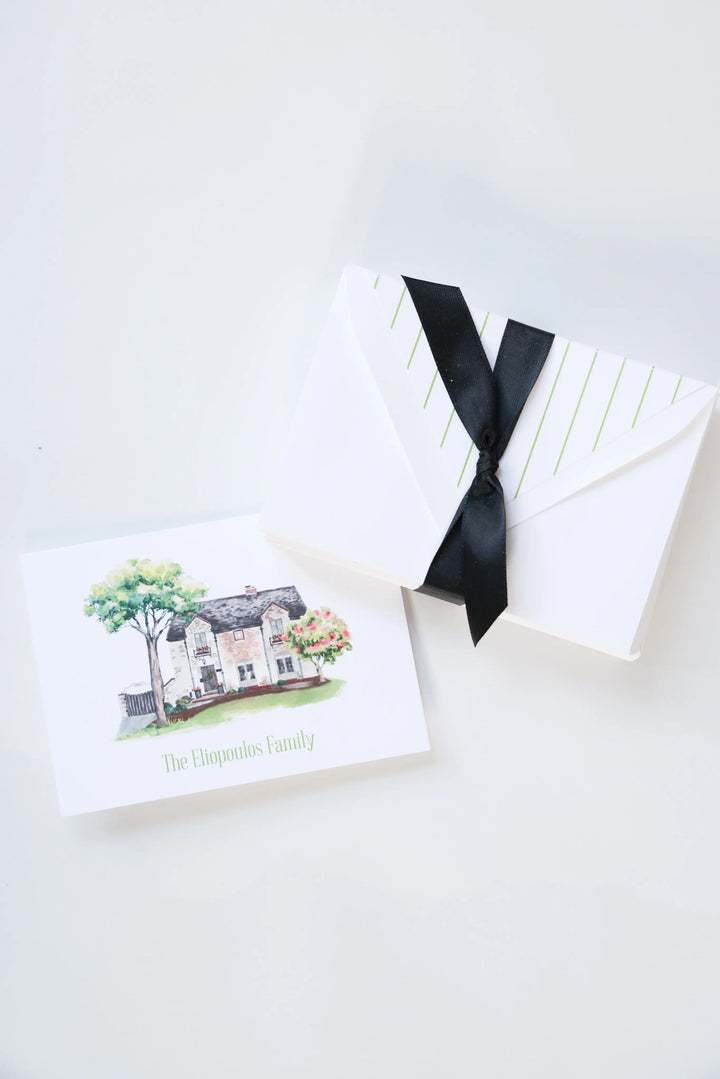 Custom Home Illustration Personalized Family Stationery with Decorative Envelope Liner (Set of 25)